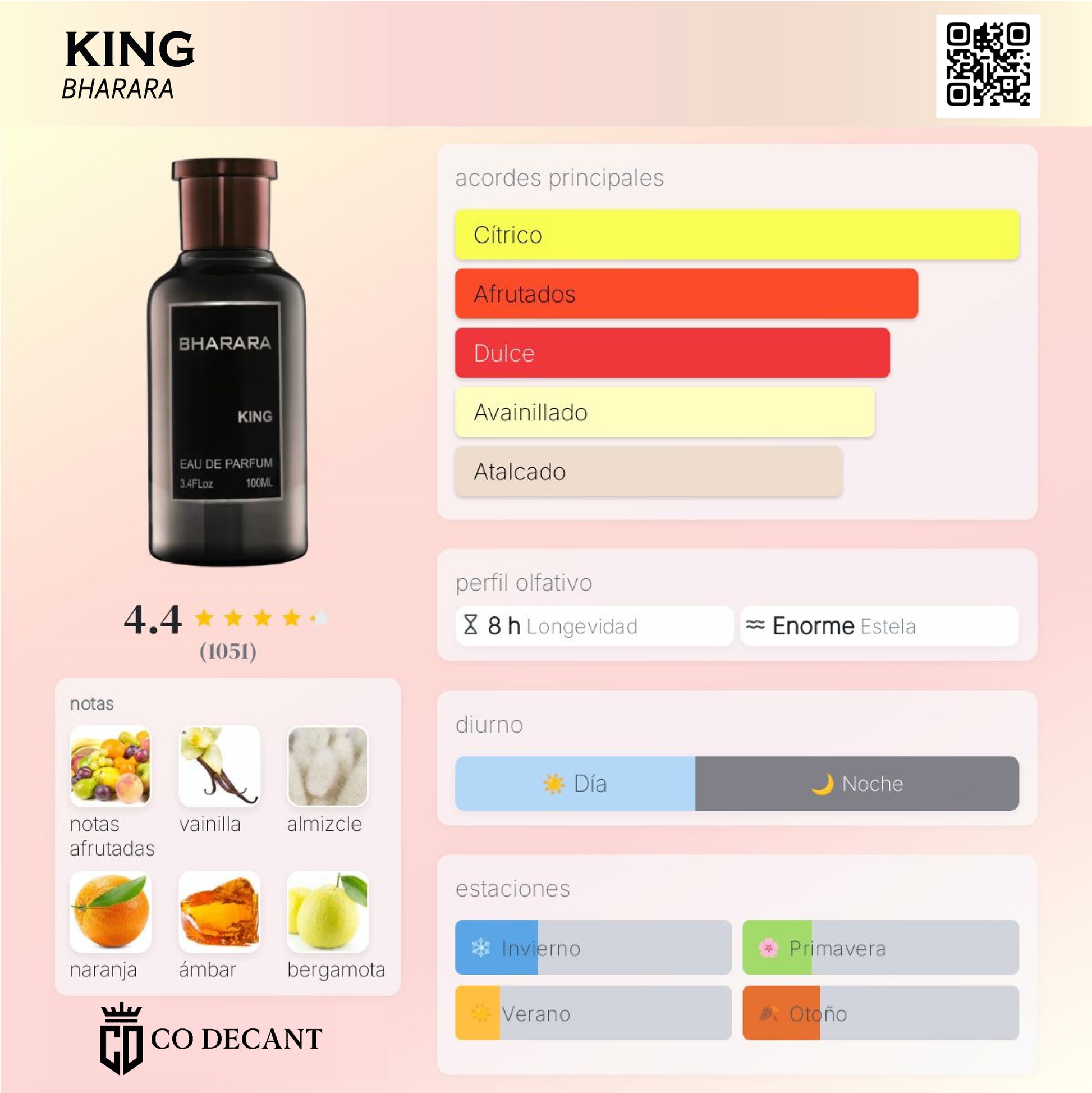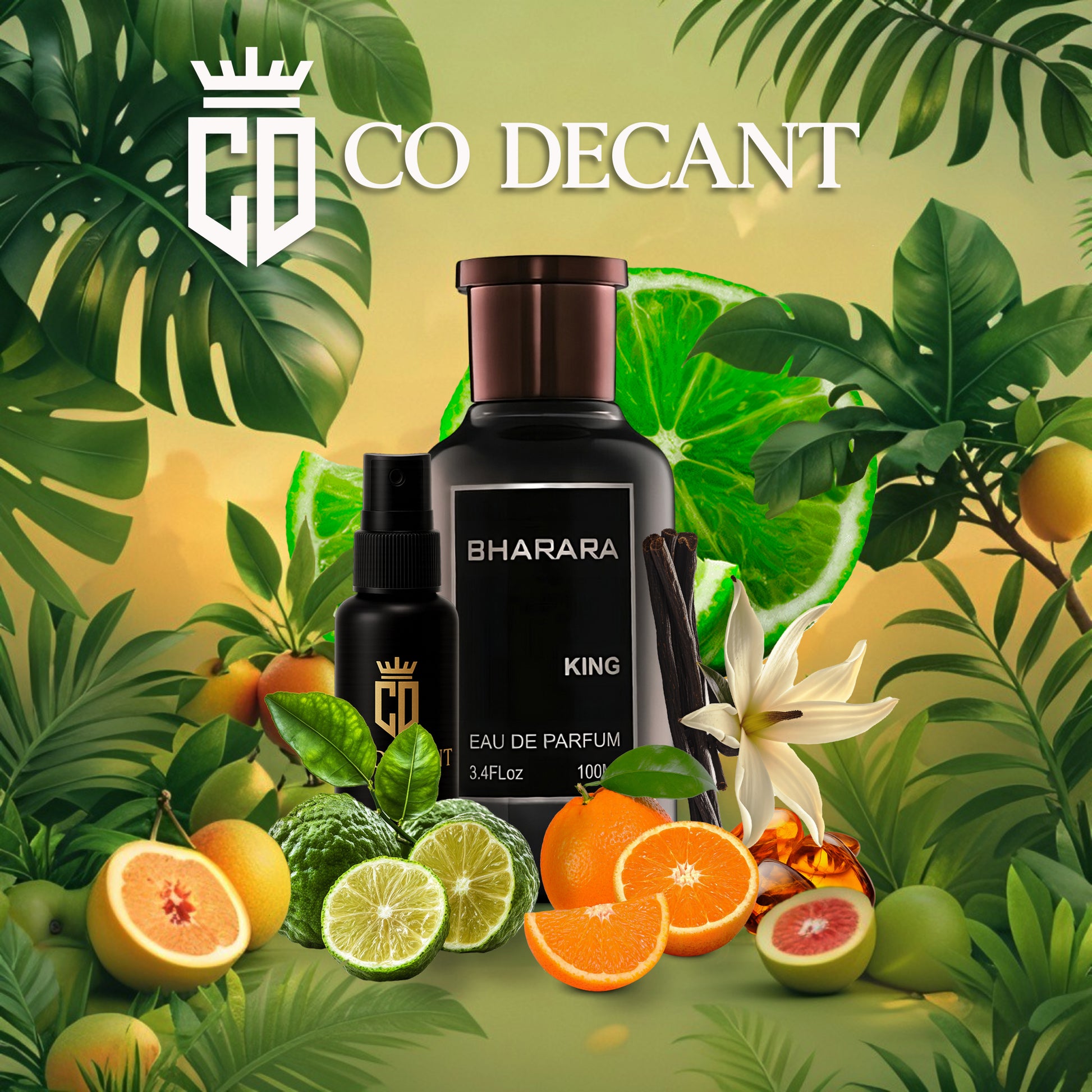 King de Bharara es una fragancia de la familia olfativa Aromática para Hombres. King se lanzó en 2021. Las Notas de Salida son naranja, bergamota y limón (lima ácida); la Nota de Corazón es notas afrutadas; las Notas de Fondo son vainilla, almizcle blanco y ámbar.